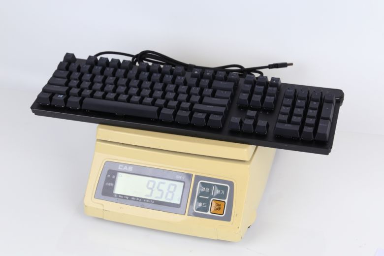 무게는 실측 기준 958g이다. 비슷한 가격대의 풀 배열 게이밍 키보드보다 확연히 가벼운 편이다.무게가 가벼운 만큼 6개의 미끄럼 방지 고무 패드가 부착된 것을 확인할 수 있었다. 특히, 가운데 부착된 고무 패드는 부피가 크기 때문에 키보드 사용 중 발생할 수 있는 밀림 현상을 최소화할 수 있다.