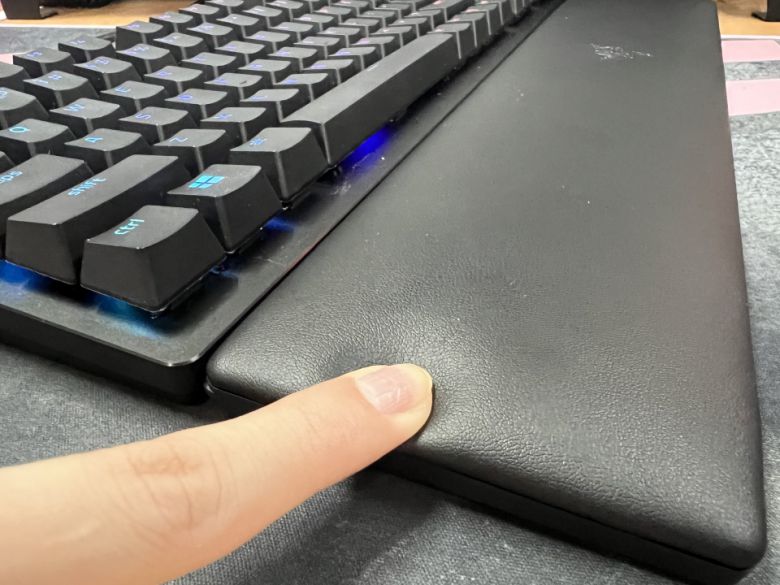 팜레스트의 재질은 아주 부드럽고 쿠션감도 수준급이다. 게이밍 키보드에 제공되는 팜레스트 중에서는 최상급이라 볼 수 있다. 덕분에 장시간 타건에도 손목이 편안했다.