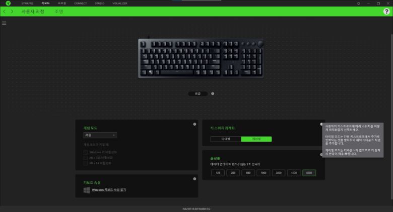 '레이저 Huntsman V2 Linear US(이하 헌츠맨 V2)'는 풀 배열, 8,000Hz, PBT 키캡, 그리고 조용한 리니어 스위치까지 모두 만족하는 게이밍 키보드다. 저소음 리듬 게임에 최적화된 스펙을 모두 갖췄다고 볼 수 있다. 헌츠맨 V2는 이름에 US가 붙은 만큼 영문 각인 제품으로만 출시됐으며, 아직 한글 각인 제품은 출시되지 않은 상태다.
