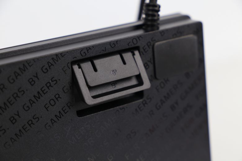 키보드 하판도 눈길을 끌었다. 하판에는 레이저의 슬로건 'For Gamers. By Gamers.'가 각인됐다. 2단계 높이 조절 다리도 품었는데, 각도까지 기재했을 정도로 디테일에 공을 들였다.