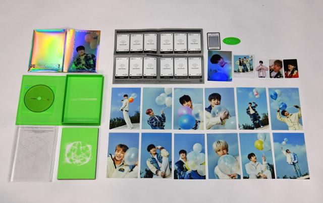 멤버들 사진을 엮은 사진집 1개, 사진 뒤편에 가사를 써둔 ‘가사 엽서 세트’ 12장, 셀피·증강현실(AR) 등 버전별 포토카드 4장, 그룹 로고 스티커, 유년 시절 사진, 폴라로이드 사진도 있었다.