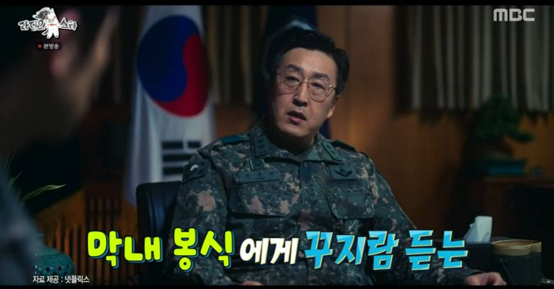그는 "계급 높은 간부로 나왔는데 실제로 계급 낮은 사람이 다 선배셨다. 구교환 선배, 김성균 선배, 손석구 선배 다 형들이다"라고 말해 좌중을 즐겁게 했다. 이어 "하도 노안 가지고 얘기가 많길래 예전에 실제 이등병 때 사진 올렸더니 대대장이 이등병 코스프레 했냐고 하시더라"며 수줍게 웃었다.