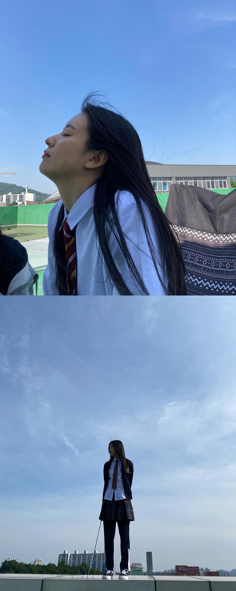 사진 속 한효주는 촬영 중 교복을 입고 불어오는 바람을 만끽하고 있는 모습이다. 한효주는 1987년생으로 올해 나이 35세지만 나이를 잊은 듯 위화감 없는 교복 차림으로 감탄을 자아낸다.