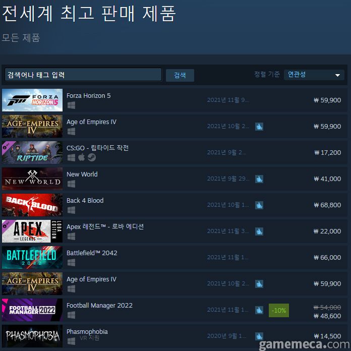 한편, 기대작 포르자 호라이즌 5가 에이지 오브 엠파이어 4를 밀어내고 다시 1위를 탈환했다. 에이펙스 레전드 로바 에디션이 6위로 내려앉았으며, 카운터 스트라이크: 글로벌 오펜시브 – 립타이드 작전이 3위로 올라왔다.