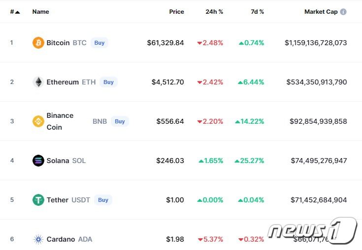 이 시각 현재 주요 암호화폐 시황 - 코인마켓캡 갈무리 |