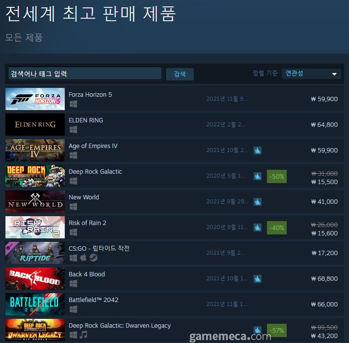 한편, 출시를 4일여 앞둔 포르자 호라이즌 5는 엘든 링의 무서운 추격에도 불구하고 굳건히 1위를 지키고 있다. 매체 및 전문가 평점을 종합한 오픈크리틱과 메타크리틱에서 올해 신작 중 최고점을 받는 등 평가도 매우 좋은데다, 방대한 게임 볼륨 등이 꾸준히 화제를 모으고 있어 출시 전날까지 이 같은 기세가 유지될 지 관심사다.