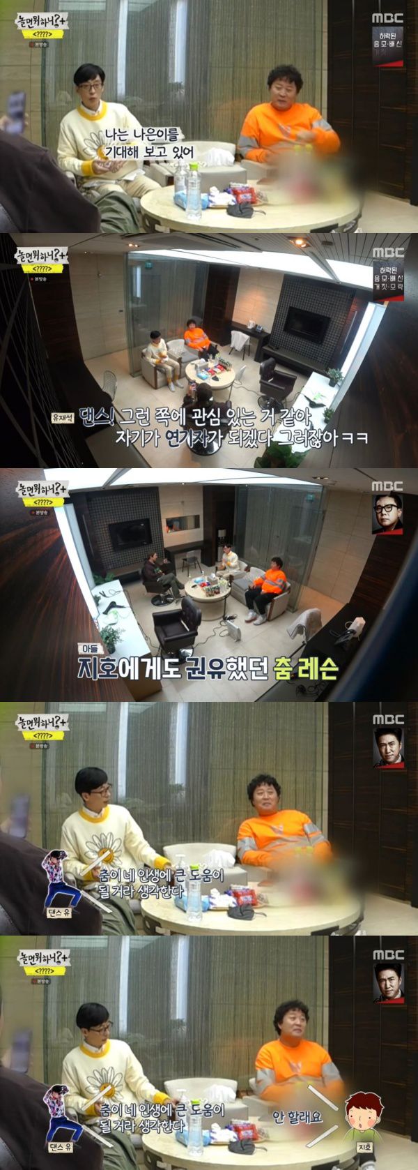 유재석은 "지호에게 춤좀 배우라고 했다"고 밝혔다. 그는 "'춤이 네 인생에 큰 도움이 될 거라 생각한다'며 춤을 권했다"며 "(지호가) 안한다고 하더라"고 했다.