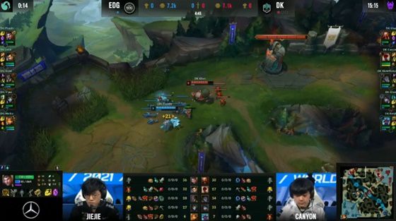 첫 번째 승부처는 15분경 펼쳐진 두 번째 전령 교전이다. EDG는 ‘베릴’과 ‘캐니언’, ‘칸’을 제압하며 앞서갔다. 하단 포탑을 제거하고 골드 격차도 벌렸다. 두 번째 드래곤도 가져왔다.
