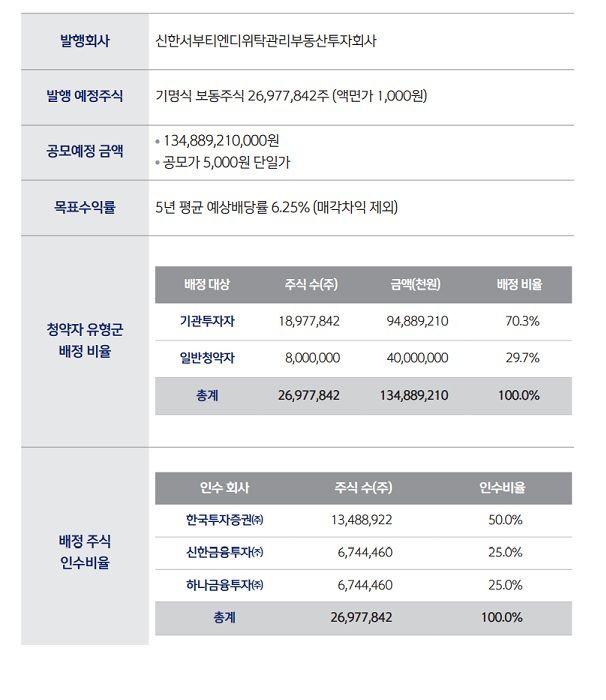 신한서부티엔디리츠 공모주식수는 2697만7842주로 주당 공모가는 5000원이다. 사측은 이번 공모로 약 1348억8900만원을 조달하게 된다. 공모자금은 자리츠의 지분 100%를 취득하는 데 활용할 계획이다.