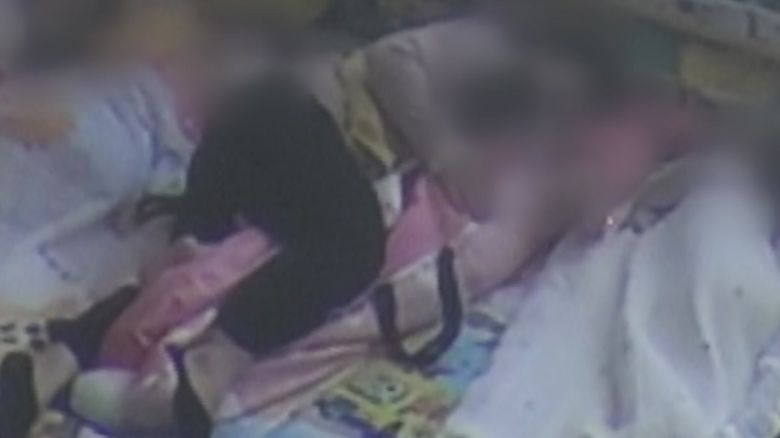 어린이집 원장이 아이를 바닥에 엎드린 채로 눕히고 이불과 함께 다리로 감싸 안습니다.