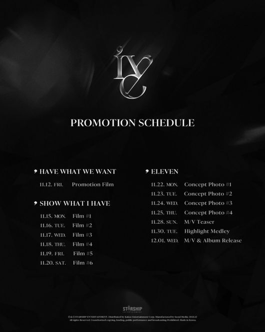 공개된 스케줄 포스터에 따르면 아이브는 ‘HAVE WHAT WE WANT(해브 왓 위 원트)’, ‘SHOW WHAT I HAVE(쇼 왓 아이 해브)’, ‘ELEVEN(일레븐)’이라는 세 가지 테마 아래 양질의 콘텐츠로 팬들을 만날 준비를 마쳤다.