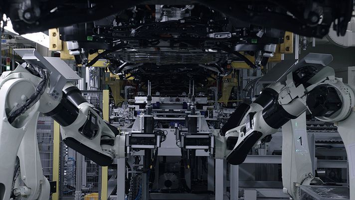 전기차인 EV6는 배터리와 구동모터를 포함한 전면부와 후면부를 모두 모듈 형태로 제작하고, 최종 공정에서 모듈 조립을 통해 완성된다. 철판을 차체로 만드는 프레스 공정’에서는 EV6의 골격을 만들고, 로봇팔이 차체 부품을 운반, 용접, 조립을 담당한다.