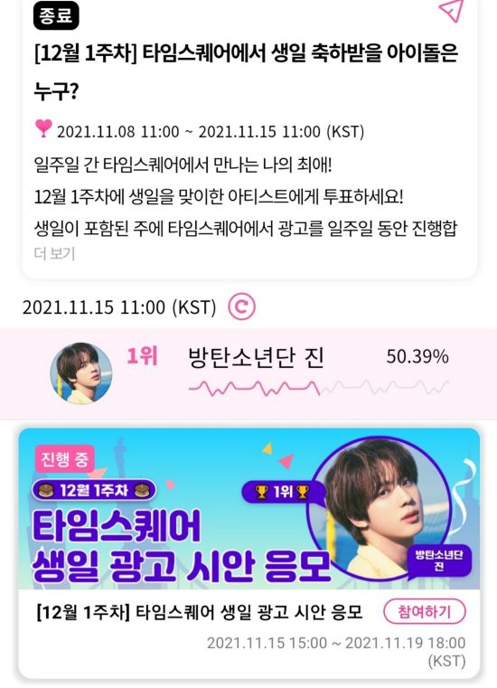 지난 8일부터 15일까지 글로벌 K팝 팬덤 플랫폼 '후즈팬'에서는 '12월 1주차 타임스퀘어에서 생일 축하 받을 아이돌은 누구?'라는 제목의 투표를 진행했다.