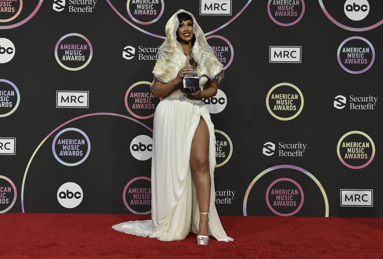 AMA 페이보릿 힙합 송 수상 트로피를 들고 프레스 룸에서 포즈를 취한 카디 비. 영국서 활동하는 한국 디자이너 박소희의 의상을 입어 화제가 되고 있다. Nov. 21, 2021, at Microsoft Theater in Los Angeles. 연합뉴스. 무단 전재 재배포 금지.