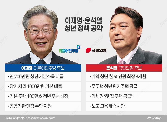 이재명 더불어민주당 대선 후보와 윤석열 국민의힘 대선 후보가 이번 대선의 '스윙 보터'로 꼽히는 청년 표심을 공략하기 위해 다양한 공약들을 쏟아내고 있다. 두 후보는 표심 구하기에 신중을 기하고 있으나, 정책적 접근에서는 뚜렷한 차이를 드러냈다.