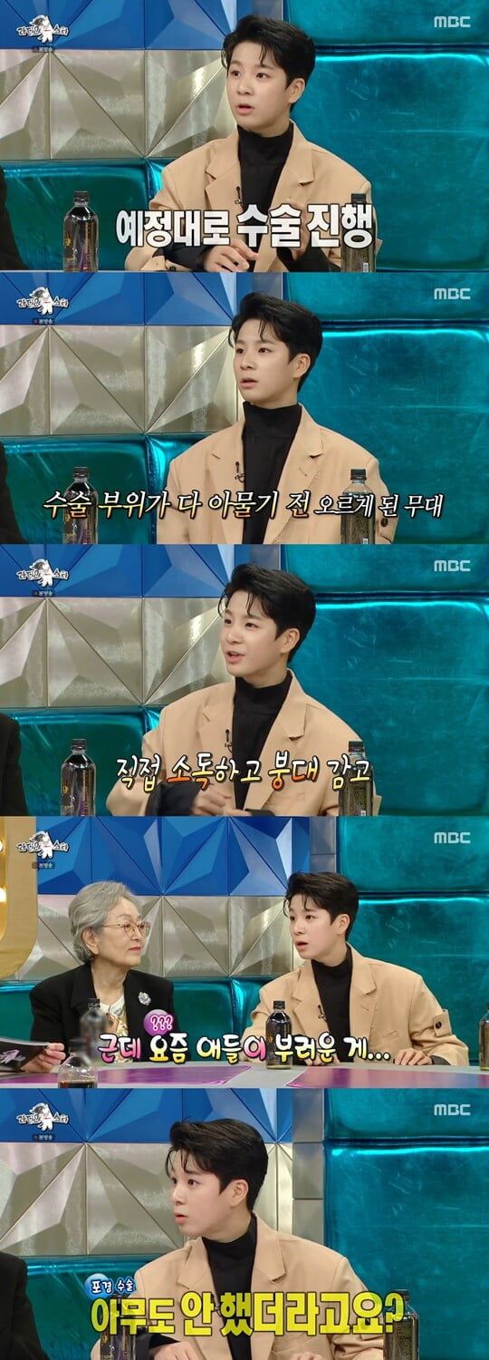 이어 "코로나19로 갑자기 '미스터트롯' 결승이 연기되면서 병원 예약은 취소가 안 되니까 결승이 연기됐으니 예정대로 했는데 갑자기 결승전이 앞당겨졌다"면서 "그래서 일주일 안 지났는데 막 제가 소독제 바르고 붕대 감고 종이컵을 찬 상태에서 부른 것이다. 그래서 걸을 때 막 아팠다"고 회상했다.