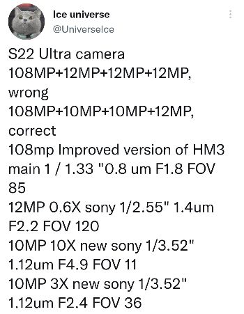 24일(현지시간) IT전문매체 폰아레나는 유명 IT팁스터(정보유출가) 아이스유니버스를 인용해 S22 울트라의 예상 카메라 스펙을 공개했다.
