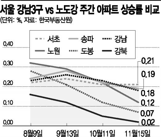 이처럼 대출 등 규제와 가격 급등 피로감에 따른 매수세 이탈이 외곽에서 먼저 나타날 조짐을 보이면서 가격 하락 충격 역시 외곽이 더 클것이라는 우려도 제기된다. 실제로 매물이 쌓이면서 외곽지역 아파트 가격 상승폭 역시 강남권에 비해 빠른 속도로 둔화하는 모습이다. 지난 8월 첫째 주까지만 해도 0.32%로 서울에서 가장 높았던 노원구의 주간 아파트 가격 상승률은 이달 둘째 주 0.12%까지 떨어졌다. 도봉구 역시 같은 기간 0.28%에서 0.07%로 둔화했고 강북구는 0.02%까지 떨어져 사실상 상승세가 멈춘 상황이다.
