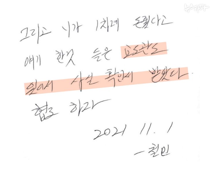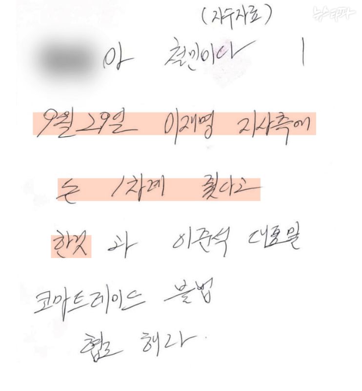 박 씨가 지난 10월 9일 자필로 작성한 5쪽 분량의 사실확인서를 다시 보자. 국민의힘 김용판 의원과 여러 언론은 박 씨의 사실확인서 두 번째 장에 몰입했다.