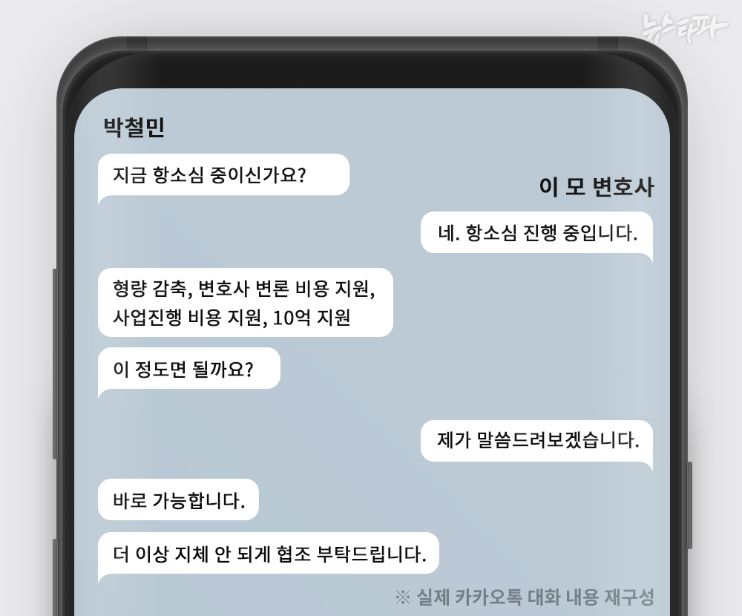 제가 이준석 씨 변호인인 걸 알고, 지난 8월 박철민 씨의 전 부인인 정 모 변호사가 먼저 연락을 했고, 이후 박철민 씨가 8월 말 구속집행정지로 나와 있을 때 직접 연락해서 저를 선임하고 싶다고 했습니다. 자신의 구치소 수용번호도 알려주며 나중에 접견을 오라고 했습니다.박철민 씨와 이 변호사 사이에 오간 문자 대화 내용을 봐도 먼저 연락을 한 것은 박 씨 본인이었다. 박 씨가 무릎 수술 문제로 구속집행정지를 받아 잠깐 출소한 뒤였던 지난 8월 말, 박 씨는 이 변호사에게 카카오톡 메시지를 보냈다. 이에 대해 이 변호사는 "누구신가요?"라고 답했다. 박철민 씨가 누구인지 모르고 있었던 것이다.