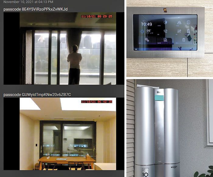 해커가 외국 웹사이트에 올린 영상… 메모지로 에어컨 렌즈까지 가리기 - 전국 일부 아파트에서 주택 관리용 단말기인 월패드가 해킹된 정황이 드러난 가운데, 지난달 외국 웹사이트에 국내 아파트로 추정되는 공간에서 사람들이 생활하는 모습이 담긴 사진과 영상이 올라왔다(왼쪽 사진). 사생활 유출을 막기 위해 월패드 카메라 렌즈에 스티커를 붙이거나(오른쪽 위 사진), 에어컨에 달린 카메라 위에 접착식 메모지를 붙여 가리는(오른쪽 아래 사진) 아파트 주민이 늘고 있다. /해외 해커 커뮤니티 캡처·독자 제공 |