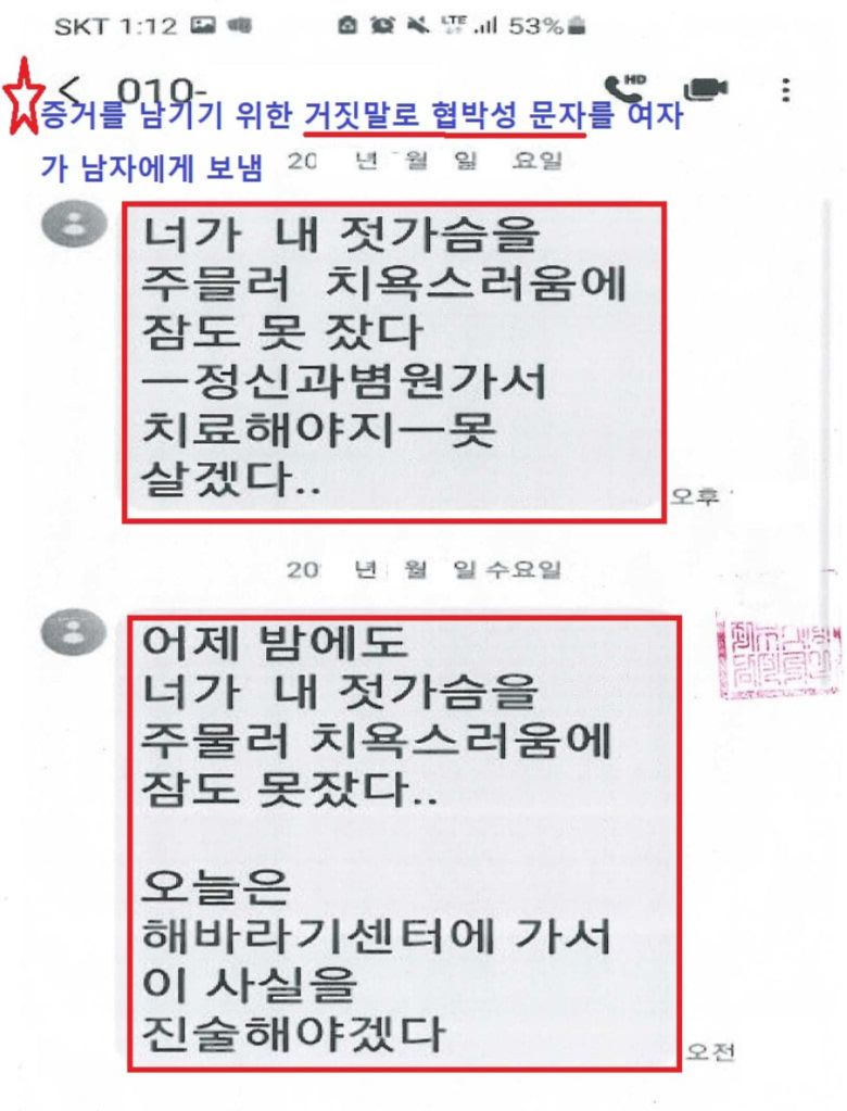A씨는 또 증거로 활용하기 위해 협박성으로 허위문자를 보냈다. “네가 내 X가슴을 주물러 치욕스러움에 잠을 못 잤다. 정신병원 가서 치료해야지”라고 하면서 해바라기센터에서 진술하겠다고도 했다.