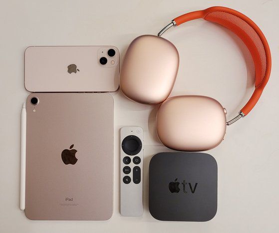 '애플 TV+' 체험을 위해 함께 사용한 다양한 애플 제품들. 아이폰13, 에어팟맥스, 애플 TV 4K 셋톱박스ㆍ리모컨, 아이패드ㆍ애플 펜슬(왼쪽 위부터 시계 방향). 하드웨어ㆍ소프트웨어ㆍ서비스를 잇는 애플 생태계를 잘 보여준다. 김경진 기자 |