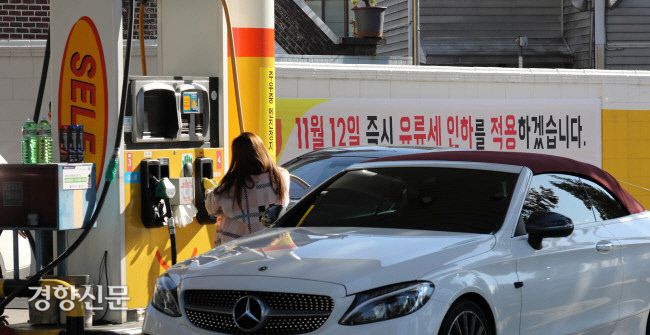유류세 인하 첫 날인 지난달 12일 서울 강서구의 한 알뜰주유소에서 시민들이 주유하고 있다. /김창길 기자