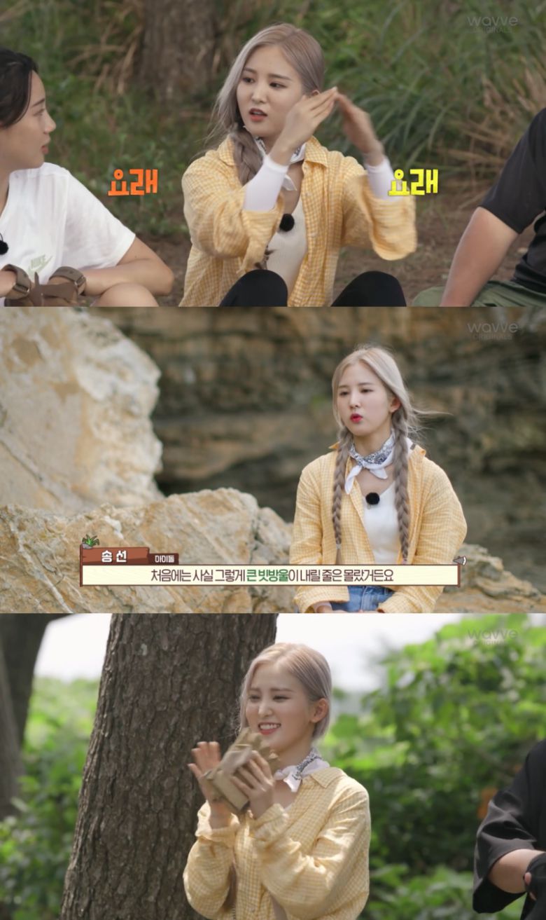 송선은 인디언 텐트 모양의 셸터를 갖고 싶었다고 말하는 등 평소 꿈꾸던 로망을 드러내며 소녀다운 매력으로 출연진들의 귀여움을 독차지했다. 또 폭염 속에서도 지치지 않는 체력을 100% 발휘하며 묵묵히 나무 더미를 옮기는 등 본인의 역할을 충실히 했다.