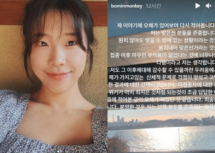 이어 "저도 그 이후에 대해 감수할 수 있을까란 두려움에서 제가 가지고 있는 신체적 문제로 걱정이 앞섰고, 고민한 결과에 대한 선택이었다"며 "미접종자에 대한 분위기가 마치 죄지은 것처럼 되는 것이 조금 답답한 마음에 적어본 글이 오해가 됐던 것 같다. 죄송하다. 분명한 것은 저는 양쪽 모두를 존중하는 마음"이라고 해명했다.