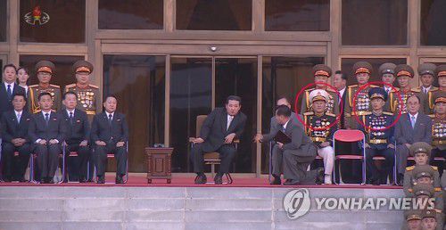 (서울=연합뉴스) 2021년 10월 11일 개막한 북한 국방발전전람회 사진으로 김명식 해군사령관(빨간 원 왼쪽)과 김충일 항공 및 반항공군사령관(빨간 원 오른쪽)이 김정은 국무위원장과 함께 앞 열에 앉아있다. 김명식 사령관은 원례 계급인 상장(별 3개)보다 낮아진 중장(별 2개) 계급장을 달고 있다. [조선중앙TV 화면] 2021.12.7