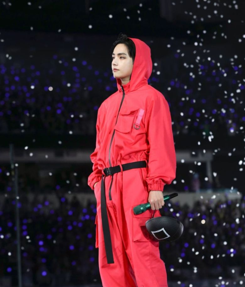 공개된 사진은 ‘오징어게임’ 진행 요원의 복장을 하고 있는 뷔의 모습이다. 마스크를 벗은 뷔가 조각같은 미모를 자랑하고 있어 보는 팬들의 시선을 사로잡고 있다.