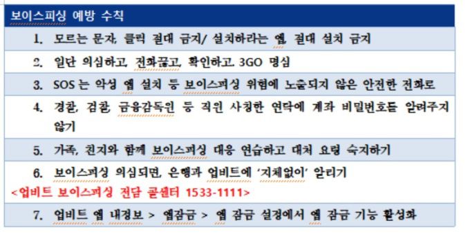 [서울=뉴스핌] 이정윤 기자= 가상자산거래소 업비트가 투자자 보호를 위해 24시간 보이스피싱 전담 콜센터를 오픈하고 주요 범죄 사례 및 피해 예방 수칙을 공개한다고 8일 밝혔다.