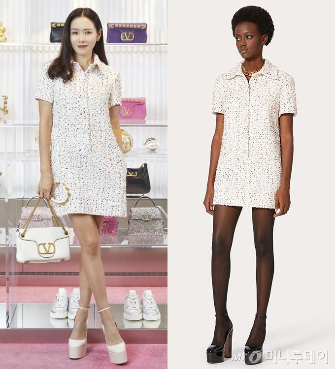 화이트 미니원피스는 발렌티노 2022 리조트 컬렉션으로, 알록달록한 멀티 컬러 트위드 소재로 제작됐으며 전면 단추 장식이 돋보인다. 가격은 3400달러(한화 약 400만원대)다.