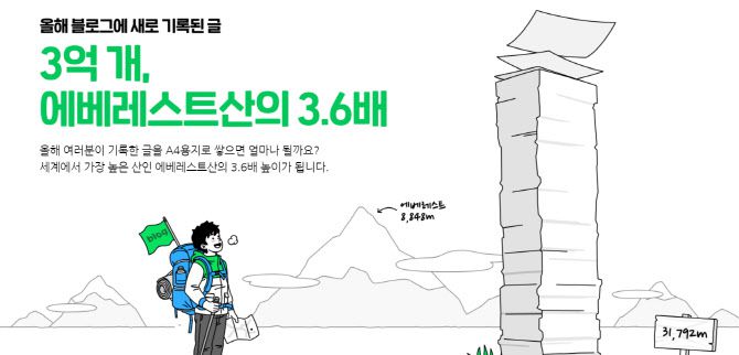 또 개별 사용자의 한 해 블로그 활동 내역을 분석해 주는 '마이 블로그 리포트' 서비스도 제공한다. 사용자들은 리포트를 통해 블로그 유입에 효과적이었던 인기 키워드, 공감을 나눈 이웃 등을 확인할 수 있다. 올해는 개별 사용자의 블로그 활동에 따라 블로그 스타일을 제공하는 서비스도 추가됐다. 한 해 동안 신규 발행된 블로그 글 수에 따라 '블린이'부터 '썸타는중 소소기록러, '넘사 갓블로거' 등 총 7 종의 스타일을 부여하고 이를 다른 사용자들과 공유할 수 있도록 했다.