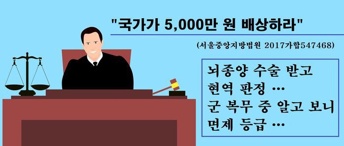 사실은팀이 뇌종양 수술을 받고 병역 복무한 사례를 취재하던 중에 판결문 하나를 발견했습니다. 뇌종양 수술을 받고 현역 판정을 받은 한 남성이 뒤늦게 면제 등급임을 알게 돼 전역조치를 받으면서 국가에 소송을 낸 사례인데, 국가가 이 남성에게 5천만 원을 배상하라는 판결이었습니다.