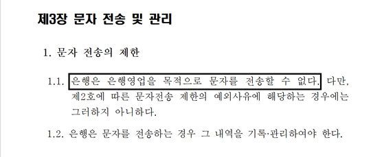 은행연합회의 비대면 은행영업 지침. ″은행은 은행영업을 목적으로 문자를 전송할 수 없다″고 나와있다. |