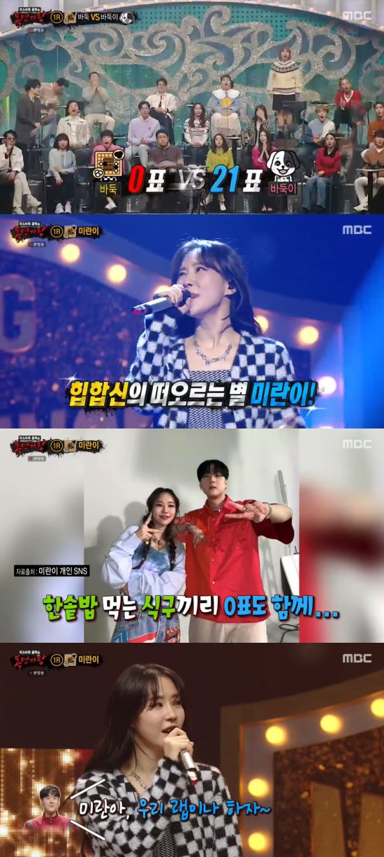 12일 방송된 MBC '복면가왕'에서는 '가왕님 제가 노래 한 수 가르쳐드리겠습니다 바둑'의 정체가 미란이로 밝혀진 장면이 전파를 탔다.