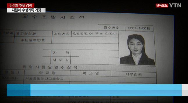 YTN은 14일 “김건희 씨가 과거 한 대학에 제출한 교수 임용 지원서에 허위 경력과 가짜 수상 기록이 기재된 사실이 확인됐다. 당시 교수 임용 지원서를 보면 설립되지도 않은 협회에서 일했다고 했거나 받지도 않은 대상을 받은 것처럼 적혀 있기도 했다”라고 보도했다.