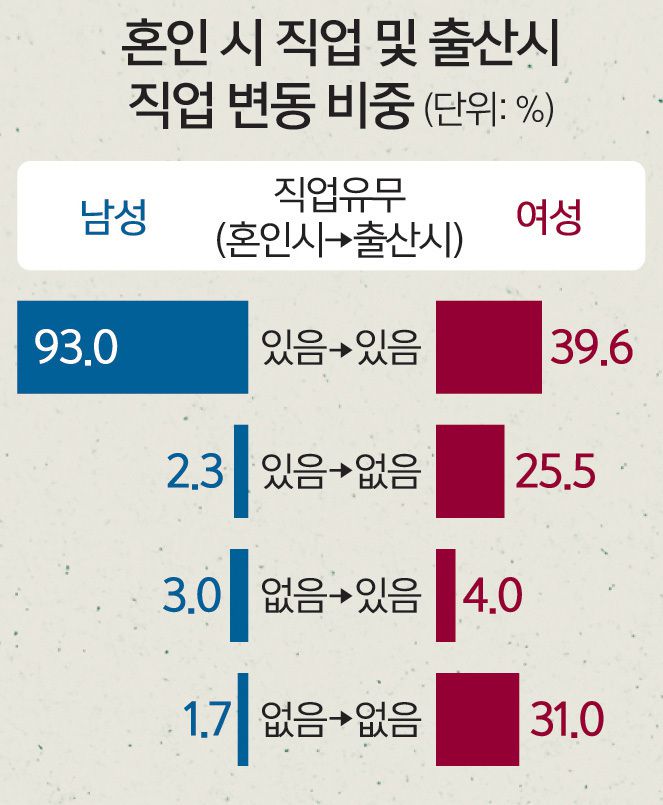 결혼할 때 직업이 있었고, 출산 후에도 직업을 유지한 비율은 남성이 93.0%였으나 여성은 39.6%에 그쳤다. 출산 후 직업이 없게 된 비중은 남성이 2.3%에 불과했지만, 여성은 25.5%에 달했다. 기혼여성 4명 중 1명이 결혼이나 출산 후 ‘경단녀’가 된 것이다.