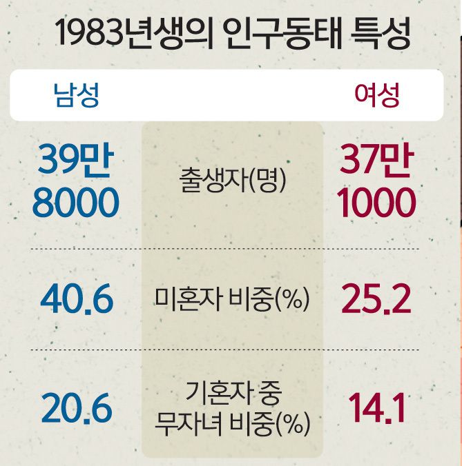 1983년생 3명 중 1명꼴인 33.1%는 미혼이었다. 미혼 비율은 남성이 40.6%로 여성(25.2%)보다 훨씬 높았다. 혼인을 가장 많이 한 연령은 남성이 30세, 여성이 29세였다.