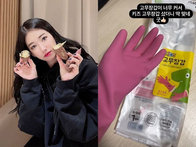 배수진은 15일 SNS 스토리에 “고무장갑이 너무 커서 키즈 고무장갑 샀더니 딱 맞네. 굿”이라며 사진을 한 장 게재했다.