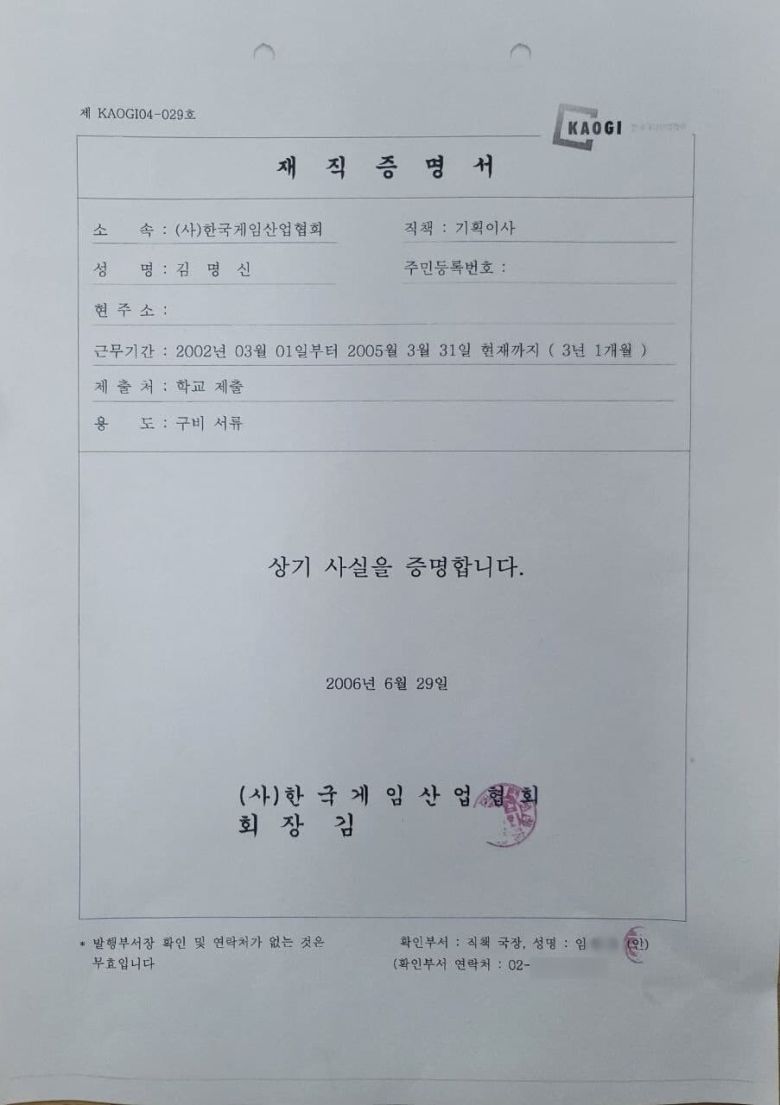 게임산업협회 초창기 로고(KAOGI)가 인쇄된 재직증명서는 몇 줄 안 되는 내용인데도 근무연도를 ‘2005년’이 아닌 ‘2005월’로 적는 허술함이 드러난다. 증명서상으로 ‘퇴직’한 지 1년3개월이 지난 시점인데 퇴직자용 경력증명서가 아닌 재직자용 증명서를 발급한 점, 증명서 발급 시점은 2006년인데 통상적인 문서 일련번호에 따르면 2004년을 뜻하는 ‘KAOGI04’라고 적힌 점이 의혹을 키운다. 게임산업협회 쪽은 “현재 재직증명서 일련번호 체계는 KGAMES로 시작한다”고 했다.