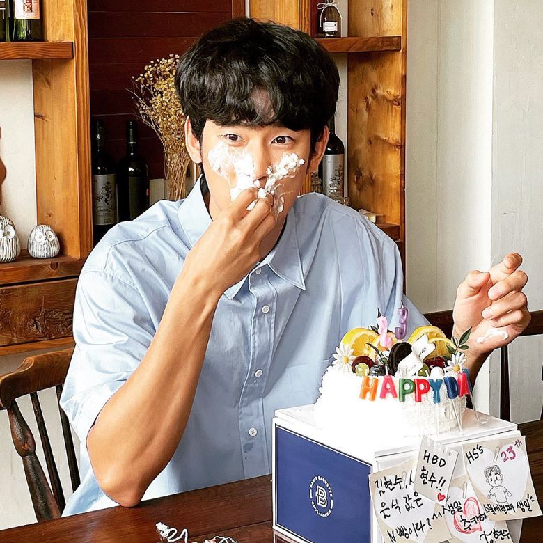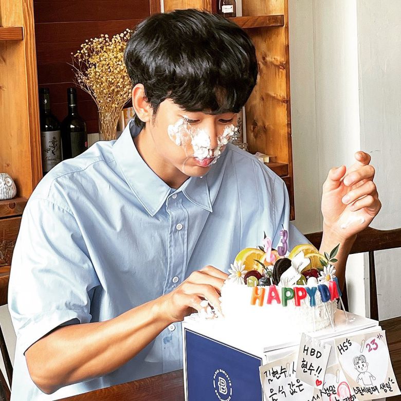 공개된 사진 속 김수현은 얼굴에 생크림을 가득 묻힌 채 손으로 케이크를 집어먹고 있는 모습이다. 쪽지에 김현수라는 이름이 적힌 것으로 보아, 드라마 '어느 날'을 촬영 현장인 것으로 예상된다.