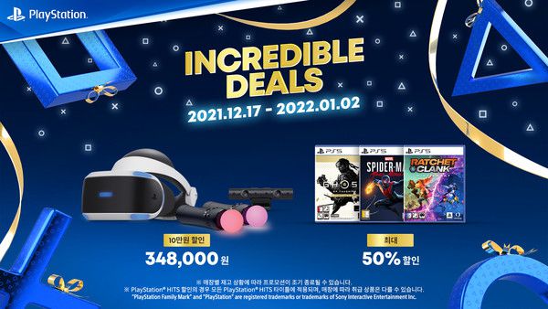 PS VR 올-인-원-팩은 34만 8000원(정상 판매가 44만 8000원)에 판매된다. PS히츠를 비롯해 PS5 전용 '고스트 오브 쓰시마 디렉터스 컷' '마블 스파이더맨: 마일즈 모랄레스' '라쳇&클랭크: 리프트 어파트' 등의 타이틀을 최대 50% 할인된 가격에 구매할 수 있다.