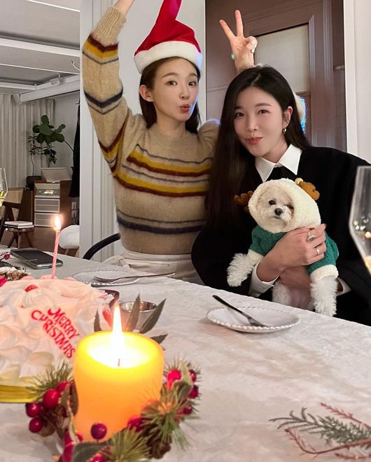 사진 속 이해리는 강민경 집에서 반려견과 함께 즐거운 크리스마스 파티를 즐기고 있는 모습. 두 사람은 거대한 트리와 산타 모자, 조명, 초 등을 활용해 크리스마스 분위기를 만끽하고 있다.