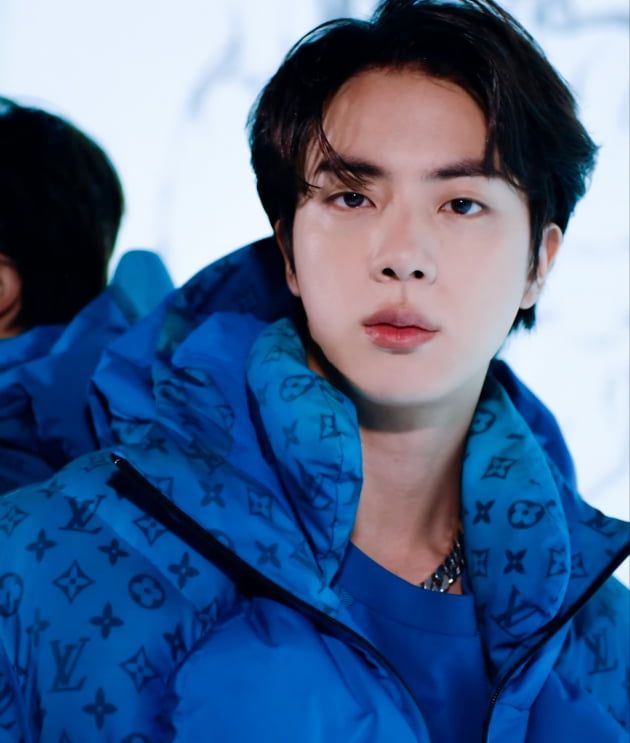 진은 블루 컬러의 티셔츠와 롱패딩, 블랙 팬츠를 타고난 피지컬로 멋스럽게 소화했다.