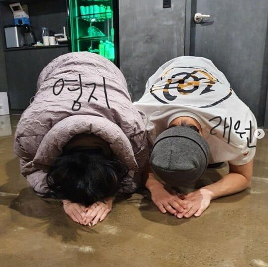 공개된 사진 속에는 래퍼 이영지와 래원이 바닥에 납작 엎드려 사죄하고 있는 모습이 담겼다.