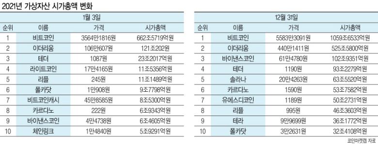 가상자산 시장은 지난 1년 동안 주식시장과 어깨를 나란히 할 정도로 커졌다. 투자자들의 뜨거운 관심 속에 주요 가상자산들의 시가총액 지형도도 크게 바뀌었다.