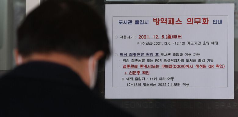 지난해 12월6일 서울 정독도서관 앞에 붙은 ‘도서관 출입 시 방역패스 의무화 안내문'. 연합뉴스 |